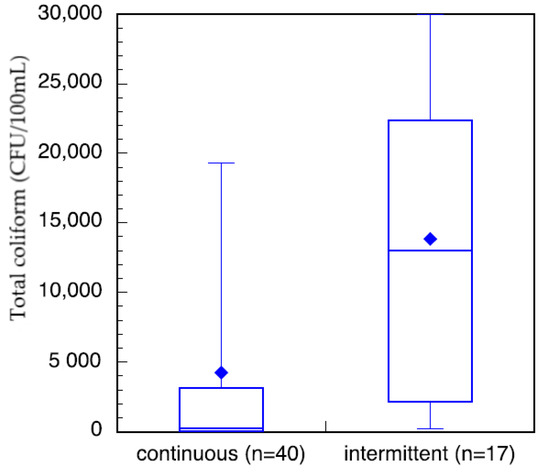 The total coliform from households in communities with verified continuous treated water had a log-normal distribution (verified by 99%, α = 1 significance level, χ2 goodness-of-fit test) and were statistically significantly lower (α = 1 significance level) than those from households in communities with verified intermittent treated water. Unfortunately, due to the low number of samples from intermittent households, a χ2 goodness-of-fit test was not meaningful.