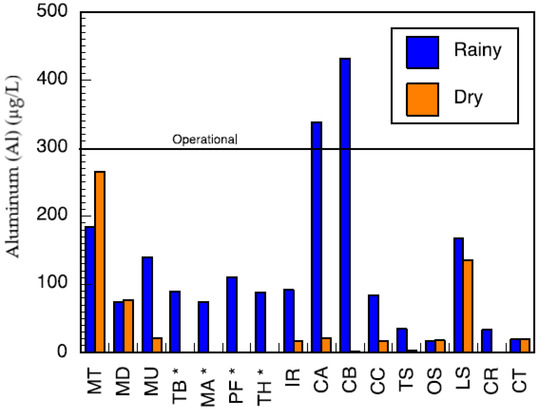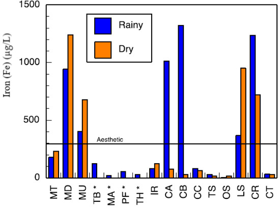Major metals in the various water sources in both seasons complied with the recommended limits of SANS and WHO in drinking water [39,42]. Sodium concentrations in the range of 3.14–41.03 mg/L and 3.02–15.34 mg/L were measured in the wet and the dry seasons, respectively (Table S4). Low values of potassium were measured. Calcium levels ranged between 0.66–33.91 mg/L and 0.53–27.39 mg/L, in the wet and dry seasons, respectively. Low levels of magnesium were also found. Most of the water sources can be classified as soft water owing to the low levels of calcium and magnesium. Aluminium (Al) concentration ranged between 39.18–438 μg/L (Figure 8). Two of the water sources which are community-based water supply systems recorded high levels of Al which exceeded the aesthetic permissible levels of drinking water; others fell within this limit. Similarly, the levels of iron (Fe) varied between 37.30–1354 mg/L and 35.21–1262 mg/L in the wet and the dry seasons, respectively (Figure 9). Some of the sources showed high Fe concentration which exceeded the aesthetic permissible limit of WHO in drinking water [42]. Two community-based water systems had higher levels of Fe in the wet season as well as the major river in the region (Mutale River) for which high Fe levels were observed in both seasons. One of the clinic boreholes also recorded high levels of Fe above the permissible aesthetic value of (300 mg/L) in both seasons. Temporary seasonal variation was significant only in the levels of Fe and Al. In the wet season, their levels were generally higher than in the dry season. Some other trace metals of concern like Pb, Hg, As, Cd, Cr, Ni, Cu, Mn, Sr were all present at low levels that were below their recommended limits in drinking water for both seasons (Table S5).