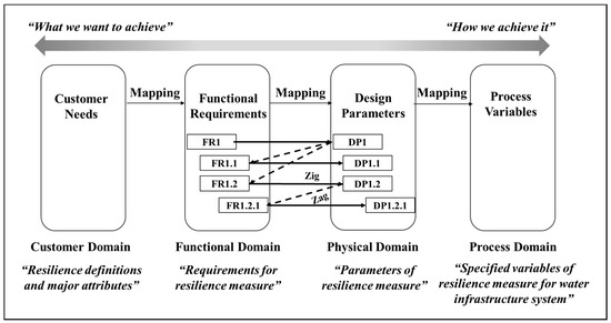 With regard to the Axiomatic Design process, the review criteria in this study are designed as follows: first, for customer needs the major capabilities of resilient systems (i.e., major attributes of resilience) are chosen from resilience definitions in various fields. Second, the FRs are defined as requirements of the resilience measure to evaluate the capabilities. Then, the DPs are defined as parameters of the resilience measure to describe the requirements. The PVs corresponding to each DP can be determined by the specified variables of the resilience measure of water infrastructure systems. Various PVs corresponding to a DP may be defined with dependence on type of water infrastructure and their purpose in water management. Since this study aims to review resilience measures of water infrastructure systems with systematic criteria, rather than design a new resilience measure of a certain water infrastructure, the authors regard DPs as review criteria.