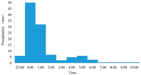 The research area is in a residential block with an area of about 0.58 km2 in Nanjing, China (Figure 1). It is adjacent to the Qinhuai River, a tributary of the Yangtze River. Because of its elevation, being lower than the water level of the Qinhuai River in the rainy season, it is one of the most seriously waterlogged areas in Nanjing City. The impervious underlying surfaces of the study area account for 73.8% of the total area. Among them, there are 0.15 km2 of rooftops, 0.046 km2 of parking lots and squares, 0.085 km2 of non-busy roads and 0.143 km2 of busy roads (Table 1). The non-busy roads are defined as roads less than 10 m wide with low traffic. A typical 20-year recurrence storm event which occurred in Nanjing from 19:00 June 12 to 7:00 June 13 in 1991 was selected for this study. The hourly rainfall data at Nanjing Meteorological Station was shown in Figure 2. The 12-h precipitation was 113.8 mm and 72% of this precipitation amount fell within two hours.