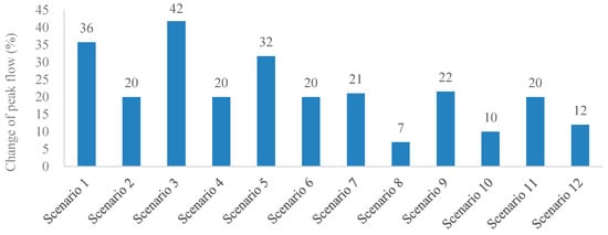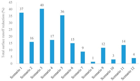 Table 5 indicates the results of the total 12-h surface runoff under original conditions without permeable pavement implementation and 12 scenarios with different permeable pavements. Rainfall falling on permeable pavements and the flow from the impervious surface to permeable pavements could be stored in the pavements. The total runoff was reduced by 1–40% (Figure 3). This is consistent with other studies. For example, Luan et al. [41] reported that permeable pavements can reduce 2–12% of runoff for different rainfall intensities in a watershed in Beijing, China. Ahiablame and Shakya [42] found that permeable pavements reduced 15–41% of flood events under different implementation areas in a watershed in Illinois, USA. Also, it was found that peak flow decreased by 7–43% with the implementation of permeable pavements (Figure 4). Nine of the 12 scenarios had a lag time on peak flow, with the exception of Scenarios 8, 10 and 12 (Figure 5). Similar findings were also found by other studies [21,23]. For example, Huang et al. [21] reported an approximately 29% decrease in peak flow with the implementation of permeable pavements in the new campus of Tianjin University, China.