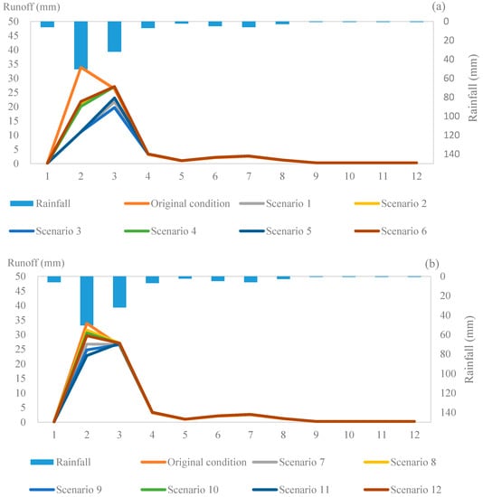 Simulated hourly surface runoff of original condition and all scenarios, (a) Scenarios 1–6; (b) Scenarios 7–12.