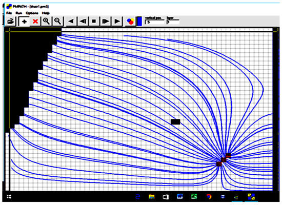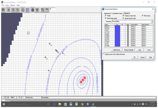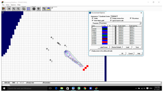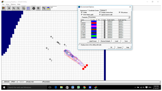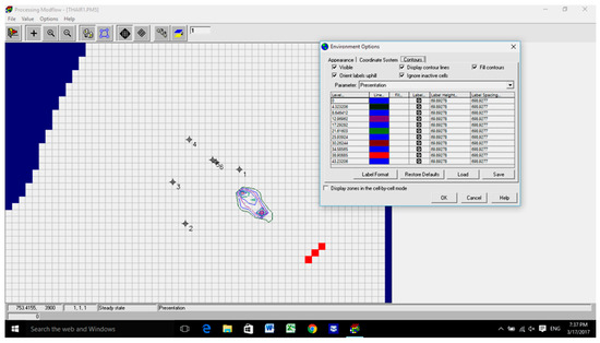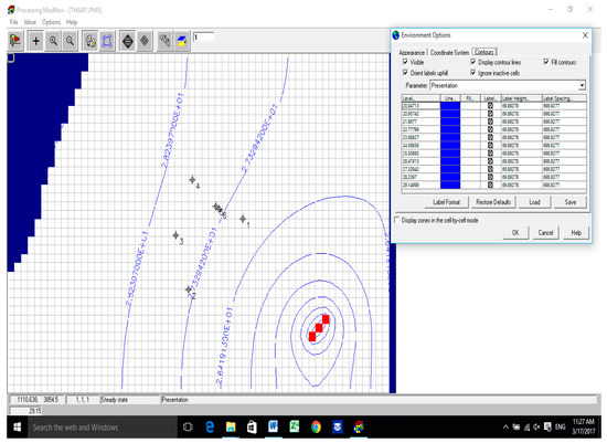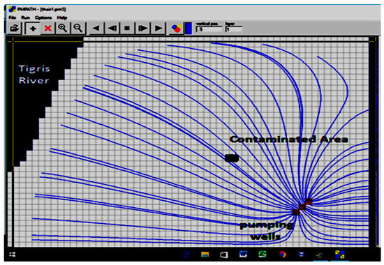 The groundwater flow in the 12.70 km2 of the study area was analyzed by using two scenarios of water surface elevation in Tigris River (29.20 m.a.s.l. (Scenario 1) and 27.60 m.a.s.l. (Scenario 2), respectively). The contaminated area was isolated by using three fully penetrating wells located next to the southeast of the boundary. This position depends on the direction of the flow path of the groundwater from (NW-SE). The total distance between them was approximately 215 m. As the first layer is unconfined for the study area, it is difficult to know the saturated thickness and the transmissivity of this layer and to know the pumping rate for each layer. The U.S. Geological Survey, in cooperation with the Minnesota Department of Natural Resources, conducted a study to characterize ground-water flow conditions surrounding aquifers. Average hydraulic conductivity values ranged from 0.05 to 5.0 ft/day for sands and clays and from 0.01 to 121 ft/day for coarse sands, gravels, and boulders. The simulated net ground-water flow was +1.34 ft3/s (0.036 m3/s), and the net groundwater flow calculated was +5.4 ft3/s (0.146 m3/s). Simulated water levels and groundwater flow for the calibrated steady-state simulation were most sensitive to changes in horizontal hydraulic conductivity, suggesting that this characteristic is the predominant parameter controlling steady-state water-level and flow conditions [22]. Thus, by using a trial and error method and the properties of the aquifer, the pumping rate for each pump was 0.015 m3/s so that the contaminated area lies within the capture zone of the pumping wells. PMWIN-PRO and PMPATH were used to construct the numerical model and to compute the capture zone of the pumping wells. The properties of the aquifer values were adjusted until simulated groundwater level in the wells matched those observed in 2002 and 2011. The steps followed to reach the calibration of the model were by using an initial estimate of the hydraulic conductivity and effective porosity. A solution computed with this initial model will then be imported and the error in the initial solution will be analyzed, New values for hydraulic conductivity and effective porosity will then be entered and a new solution will be generated and a new error estimate will be computed. These steps will be repeated until the error is reasonably small. The best match was achieved with an aquifer horizontal hydraulic conductivity for the three layers of (5 10−7, 5 × 10−4, and 3 10−2 cm/s, respectively). The effective porosity values were 16%, 28% and 35%, respectively (Table 3). The flow, plume extent velocity, dispersion coefficient and retardation were highly sensitive to change in the effective porosity. The simulated flow and equipotential lines of the groundwater for the two scenarios are shown in Figure 4, Figure 5, Figure 6 and Figure 7. The simulated water table elevation near the three pumping wells was 20.96 m.a.s.l.
