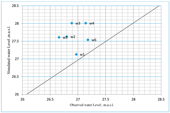 Comparison of simulated and observed heads for average water surface elevation of Tigris River (29.20 m.a.s.l.), Scenario 1.