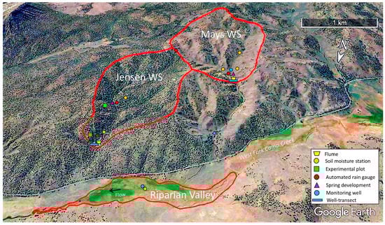 Map of the study area showing Mays WS, Jensen WS, and the Riparian Valley sites, indicating the location of different monitoring instrumentation used in this study.