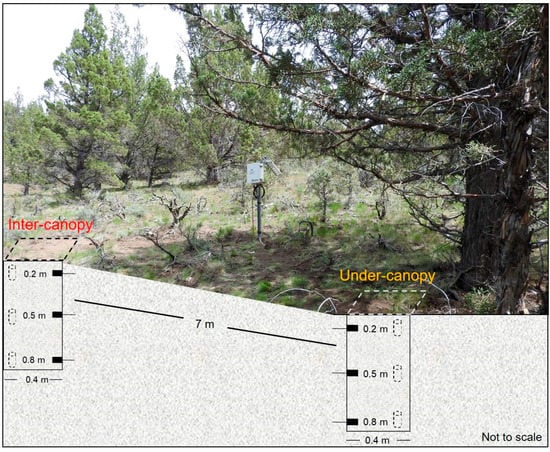 Schematic illustrating soil moisture sensor placement and soil sampling depth at under-canopy and inter-canopy locations in the upstream plot in Jensen WS.