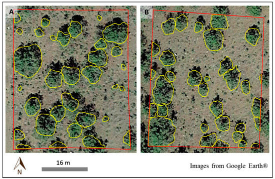 Satellite images illustrating juniper trees (outlined in yellow) in the downstream (A) and upstream (B) experimental plots.