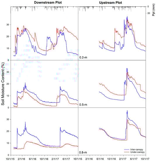 A seasonal θ response to precipitation inputs was observed in the Jensen WS plots at all sensor depths. Figure 4 shows daily-averaged θ for the three different sensor depths (0.2, 0.5, and 0.8 m) at under-canopy and inter-canopy locations in both plots. Greater θ values were observed at the peak of the snowmelt runoff season in spring. The limited summer precipitation characteristic of the region was reflected in the decreasing θ values at all sensor locations during the dry season, reaching their lowest θ in fall and winter. The potential effects of tree canopy interception on θ were more evident in the deeper soil profile in the downstream plot. Greater θ levels were obtained at the inter-canopy location for both the 0.5 and 0.8 m sensor depths in this downstream plot. This may be due in part to higher sand content values at all depths at this location (Table A1). The effects of tree canopy interception on topsoil moisture were observed during periods of rain and early snowmelt runoff in January 2017. For example, greater θ levels were observed in the downstream plot for the 0.2 m sensor depth in the inter-canopy location in the fall of 2016. However, greater θ levels at the 0.2 m depth were generally observed most of the time for the under-canopy location in both plots (Figure 4).