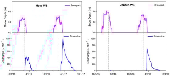 Snowpack and streamflow relationships during the years 2016 and 2017, when greater snowpack depths were observed, are illustrated in Figure 5. In 2016, snowpack depth rose to 0.4 m at Mays WS (treated) and to 0.6 m at Jensen WS (untreated) in mid-January and remained at that level until early February when it started melting. The snowmelt period that started in mid-February in 2016 generated almost an immediate streamflow response in Mays WS but not in Jensen WS. For Mays WS, streamflow peaked at 440 L min−1 on 3 March. For Jensen WS, streamflow peaked at 24 L min−1 on 1 March. In year 2017, snowpack began to build in early December and rose to 0.5 meters by mid-January in both Jensen WS and Mays WS. Snowpack in both watersheds persisted until early March when snow began melting, and within two weeks, the snowpack was negligible in both watersheds. Streamflow peaked at 1020 L min−1 for Mays WS on 19 March. For Jensen WS, streamflow peaked at 687 L min−1 on 17 March (Figure 5).