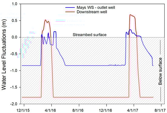 Snowmelt runoff resulted in transient surface and subsurface flow connections in the stream in Mays WS. For example, Figure 6 shows streamflow response to the 2016 and 2017 snowmelt runoff seasons along the stream draining out of Mays WS. In the well installed in the streambed at the watershed outlet, the first response was observed below the surface on 11 February 2016. Water level rose sharply and peaked 7.5 cm above streambed surface on 19 February, then water level fluctuated above and below the surface until the end of April when it began a steady decline. The first response of the downstream well, located 1000 m downstream, was observed on 16 February. Water level in this well peaked at 0.5 m above streambed surface on 5 March, and remained above the surface for about three weeks until it dropped to baseflow conditions on 9 April 2016. In year 2017, the first response in the outlet well was observed below the surface on 25 February; water level peaked at 0.23 m above streambed surface on 16 March 2017, then returned to baseflow conditions on 2 May 2017. The first response in the downstream well was observed on 10 March, peaked at 0.7 m above streambed surface on 16 March, then returned to baseflow conditions on 14 April 2017 (Figure 6).