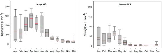 Springflow rates during the last two years evaluated were at near maximum levels observed during the entire period of record (2004–2017). For the year 2017, springflow rates were highest in March in both watersheds and were measured at 187 L min−1 in Mays WS and at 109 L min−1 in Jensen WS. For the year 2016, springflow rates were highest in mid-April and were measured at 189 L min−1 in Mays WS and at 76 L min−1 in Jensen WS.