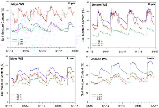 Soil moisture content fluctuations at different soil depths at upper and lower locations in both watersheds from 1 October 2013 through 27 July 2017. x-axis indicates month/day/year.