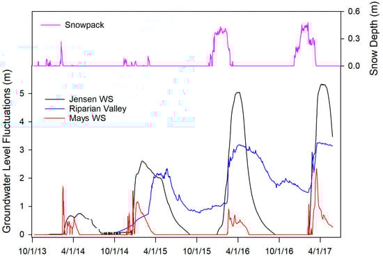 Figure 9 shows four years of snowpack depth in Jensen WS and shallow aquifer fluctuations in both watersheds and in the Riparian Valley. It can be observed that snowpack accumulation was considerably higher in 2016 and 2017 than in years 2014 and 2015. Also, groundwater level rises were considerably higher in the Jensen WS and Riparian Valley well locations in 2016 and 2017 when compared to previous years. Peak groundwater-level rises over 5 m were observed in Jensen WS during the snowmelt runoff season in years 2016 and 2017. Early in the aquifer recharge season, a relatively rapid groundwater level rise and decline pattern was observed in Mays WS during most years evaluated. The location of the Mays WS wells in mostly fractured rock substrate may have contributed to the quick transport of groundwater out of the site that resulted in less pronounced groundwater mounds observed during the aquifer recharge season. A faster response and a higher groundwater level peak were observed in the Riparian Valley well in 2016 and 2017 when compared to the response in the previous, drier, year 2015. Soil moisture content in the Riparian Valley remained at or near saturation levels since sensor installation in the spring of 2016 and that was reflected in the groundwater level fluctuations observed during the last two years at this site.