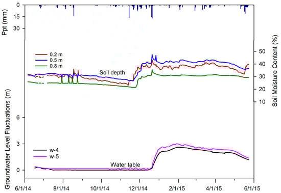 3.2.3. Soil Moisture and Shallow Groundwater Level Fluctuations
