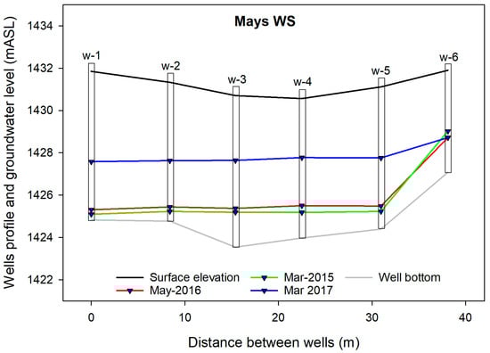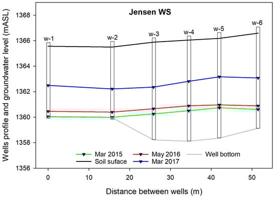 Figure 11 shows a cross-sectional view of groundwater level fluctuations along the 6-well transect installed in each watershed. Manual measurements of depth to water table, depth to well bottom, and soil surface elevation were used to construct the cross-sectional profile in each watershed. The bottom of all wells are at, or very close to, bedrock level, thus it reflects a significant section of the underground channel profile at the outlet of each watershed. Depth to water table was substantially shallower in March 2017 when compared to the March 2015 and May 2016 readings in all but w-6 in Mays WS. Since juniper removal, w-6 in Mays WS has consistently remained at shallower groundwater depth than the rest of the wells in that transect, this was also shown during the three different dates evaluated. The highest water table levels were observed in March 2017 when a depth to water table of 3.2 m was measured in w-4 in Mays WS and w-5 in Jensen WS. This contrasts with the lower water table levels observed in March 2015 when depth to water table was 6.8 m in w-1 in Mays WS and was at 6 m depth in w-6 in Jensen WS (Figure 11).