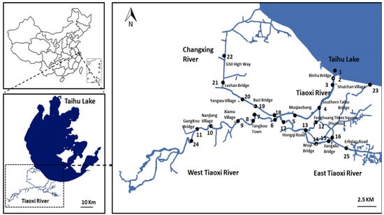 This study was carried out in the Tiaoxi River, which is one of the major rivers connected to Taihu Lake. The main stream of the Tiaoxi River is 158 km in length, comprising East and West Tiaoxi Rivers. The annual inflow of Tiaoxi River to Taihu Lake is 2.7 billion m3, which is approximately 60% of the total source water input of the lake []. Furthermore, it serves as a drinking water source and also supplies water for agricultural and industrial purposes for many cities located in northern Zhejiang Province, China []. Upstream, the river flows through agricultural areas, while the downstream part flows within the urban cities of northern Zhejiang Province and is subject to industrial inputs. The river collects waters from a population of approximately one million inhabitants, primarily located in moderately sized cities such as Huzhou along the river stream [].