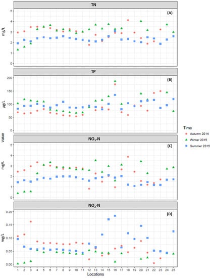 Spatial and temporal variations in physico-chemical parameters: Total Nitrogen (A), Total Phosphorus (B), Nitrate-N (C), Nitrite-N (D).