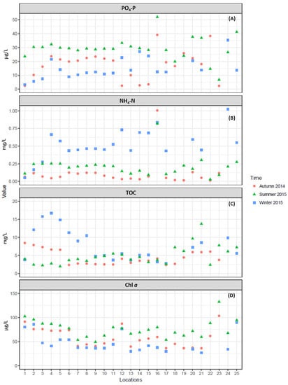 NH4-N levels were outside standard limits (>1 mg/L) in Location 16 in autumn and at Location 24 in winter (Figure 3B). NH4-N enters into water mostly from anthropogenic sources such as human sewage, municipal effluent discharges, livestock manure, and agricultural runoff. Elevated levels of NH4-N in surface water primarily exert toxic effects on the higher aquatic organisms such as fish and shrimps []. Xu et al. [] reported similar results for surface water quality in the Taihu watershed. There are no specific standards for PO4-P as per MEP, PR China, but a concentration of <20 µg/L is commonly present in streams and rivers. Elevated levels of >20 µg/L indicate pollution and can lead to excessive algal growth []. In the present study, PO4-P levels were high in all locations (Figure 3A) on one or more occasions; however, no significant correlation between PO4-P and Chl a was observed (Table 3). Similarly, for TOC there are no specific standards set by MEP, PRC. Both PO4-P and TOC levels showed statistically significant (p < 0.05) spatial variation (Table 2, Figure 3C,D). Most of the surface waters with low nutrient levels have Chl a levels of <2.5 µg/L, but higher levels can be seen if there is high nutrient availability []. In the current study, all locations showed higher Chl a levels in all seasons, indicating high algal growth in Tiaoxi River water (Figure 3D). Chlorophyll a levels were high in the summer season followed by in autumn and winter, which can be correlated with warm temperatures in the summer and autumn seasons and the availability of nutrients. In general, the concentration of Chl a was high if the location had a high TP concentration. Xu et al. (2010) [] reported similar results for Chl a levels in Taihu Lake water. The prevalence of cyanobacteria and higher concentrations of Chl a during the summer season in Taihu Lake has been reported previously [,]. The highest Chl a levels were observed at Locations 1, 12, and 23 during the summer season, and Chl a concentrations were statistically significant both spatially and seasonally (p < 0.05) (Table 2).