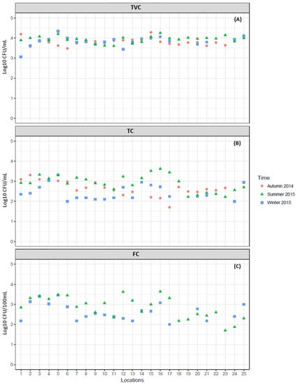 Spatial and temporal variations in microbiological parameters: Total viable count (A), Total coliforms (B), Fecal coliforms (C).