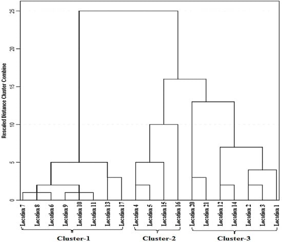 Cluster analysis (CA) is a common technique for statistical data analysis and exploratory datamining applied in many fields of research as well as for water quality assessment [,]. With the aim of studying the spatial variability of water quality in Tiaoxi River basin and grouping similar sampling locations, hierarchical agglomerative clustering was performed using the normalized dataset. Ward’s method of linkage with squared Euclidean distances was used as a measure of similarity []. Previous studies indicated that CA reliably classifies surface water quality and the results can be used as a guide for developing sampling strategies for the future [,].