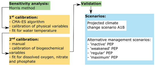 For the model calibration and validation, we used field data from the period 2008–2014. The data are summarized in Table 1 together with the applied preprocessing steps. Further calculations and evaluations were done by using MATLAB R2017a (The MathWorks Inc., Natick, MA, USA), and lake-specific variables were calculated using the LakeAnalyzer software [47]. An overview of the modeling framework is given in Figure 2, and the specific methods are explained in the following sections.