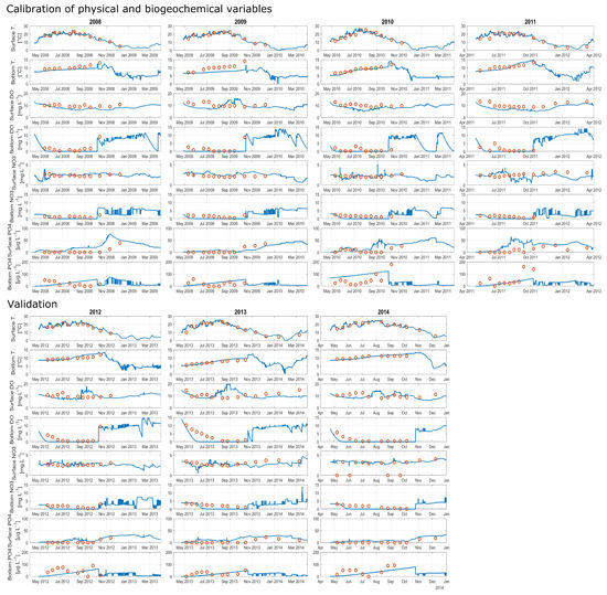 The results for the validated years were similar to the results for the calibrated years. The years 2012, 2013 and 2014 achieved NSEs for water temperatures of 0.87, 0.85 and 0.87 and for dissolved oxygen of 0.56, 0.24 and 0.73 (Appendix A, Figure A1D–F). The bottom nitrate concentrations of all validated years were underestimated (Figure 5). The replication of bottom phosphate concentrations was in a good agreement for 2012 and 2013. In 2014, the bottom phosphate fluxes were underestimated (RMSE: 29 mg L; Appendix A, Table A1).