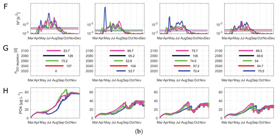 The median, maximum and minimum surface water temperatures were increasing over all management scenarios before reaching levels in 2100 that were similar to those for 2040 (Figure 6A). In all scenarios, the highest median water temperatures were projected in the years 2060 and 2080. Because of this general temperature trend in all management scenarios, for the visualization of the time series of buoyancy frequency and phosphate concentrations, we only investigated 2020, 2060 and 2100 (Figure 6F,H). All scenarios with an active PEP projected similar water temperature differences (Figure 6B). The water temperature differences peaked in 2080 before declining at the end of the century. Compared to the other management scenarios, the inactive management scenario projected the highest maximum and median values of water temperature differences between surface and bottom layers in 2040, 2060 and 2080. The stratification period extended in all scenarios, with a shift of the stratification onset from the middle of April to late March (Figure 6C). In the inactive scenario, the results of the relative thermocline depth showed signs of a disappearance of the winter stratification period (Figure 6D). Here, the thermocline still reached the maximum depth of Lake Tegel in December, whereas the other three scenarios determined a developing thermocline beginning in December, depicting a stratification in winter. Further, when the discharges of the PEP were increased (weakened, regular and maximum), an increased thermocline deepening could be observed between late August and September, which vanished again in the middle of September. Nonetheless, this short thermocline deepening period reduced the successive time of the summer stratification period. The simulation showed that during the prolongation of the stratification, 2060 and 2080, there were only short periods when the thermocline reached the mean lake depth. The changes in the calculated lake-wide Wedderburn number were similar for the regular and maximum scenarios, with higher values in 2020 and 2080 (Figure 6E). In the inactive as well as weakened scenarios, the Wedderburn numbers increased strongly until 2080 before decreasing to a similar level as in the other two scenarios. Here, the inactive scenario projected the highest mean as well as maximum values of the Wedderburn number, which were mostly over 1. The inactive scenario projected higher buoyancy frequencies over compared to the other scenarios (Figure 6F). In all scenarios, the buoyancy frequency was well over from April to October. In all scenarios, 2100 showed a slightly longer duration of the buoyancy frequency over until the end of September. The duration of a critical oxygen depletion in bottom layers was similar over all scenarios (Figure 6G). The inactive scenario projected a slightly longer oxygen depletion duration in 2060 and 2080 compared to the other scenarios. The weakened, regular and maximum scenarios projected phosphate peaks during the summer months that were similar to a projected winter phosphate plateau (Figure 6H). In contrast, in the inactive scenario, the projected summer phosphate peak surpassed the winter plateau. The highest integrated phosphate concentrations were projected in the inactive scenario (60 g L), followed by the weakened scenario (40 g L) and the regular and maximum scenarios (both about 35 g L).