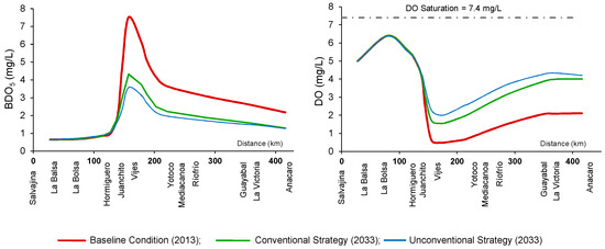 The MIKE 11 model showed that the minimum DO for the baseline was 0.6 mg/L (Puerto Isaacs Station, km 155) (Figure 2), while the implementation of the conventional and unconventional strategies caused this value to increase to 1.6 mg/L and 2.0 mg/L (Paso de La Torre Station, km 171), respectively.