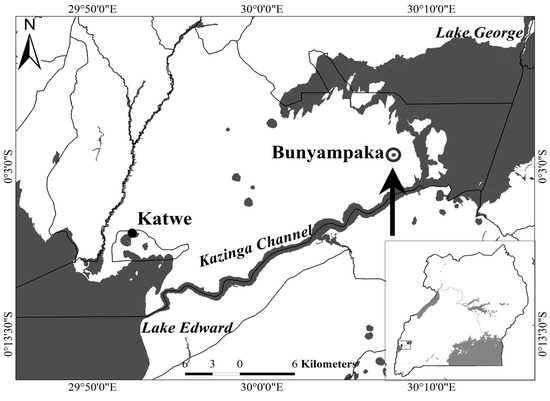 Detail map showing Lake Bunyampaka (left; see arrow) and its location in Uganda (inset bottom right).