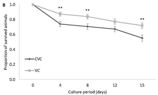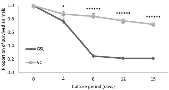 As shown in Figure 2A,B, both strains of Artemia survived in Lake Bunyampaka saline water when diluted to 30 g L−1. The survival of the GSL strain was significantly lower than the control for GSL (CGSL) from day 4 up to day 15 (Figure 2A). The mean differences of the proportion of survived animals for CGSL versus GSL were 0, 0.1266, 0.4933, 0.4934, and 0.4734 for the time points of day 0, 4, 8, 12, and 15 of culture, respectively. For the VC strain, there was a gradual decline in survival in the Lake Bunyampaka water over the entire culture period, but the survival of VC was significantly higher than that of the control for VC (CVC) (Figure 2B). The mean differences of the proportion of survived animals for CVC versus VC were 0, 0.1333, 0.1333, 0.1, and 0.1667 for the time points of day 0, 4, 8, 12, and 15 of culture, respectively. Comparison between the two strains showed that from day 4 onwards up to day 15, VC exhibited a significantly higher survival than GSL (Figure 3). The mean differences of the proportion of survived animals for GSL versus VC were 0, 0.1066, 0.5933, 0.56, and 0.5067 for the time points of day 0, 4, 8, 12, and 15 of culture, respectively.