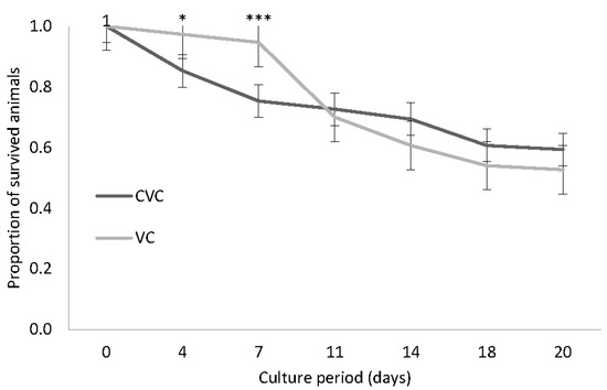 From Experiment 1, as seen in Figure 3, VC seemed to be the most promising strain. Therefore, a second experiment was performed with the VC strain for an extended culture period, whose aim was also to obtain sufficient animals for the reproduction test (Experiment 3).