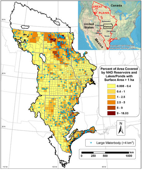 Waterbody summary information from the U.S. Geological Survey National Hydrography Dataset (NHD) is shown for the U.S. Great Plains [30,31]. Aggregation zones used in the main map are county boundaries. 24 federally constructed reservoirs in the central state of Kansas (most of which correspond with blue dots) are the focus of this sedimentation study.