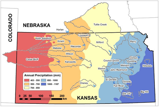 Annual rainfall indicates a gradient from west (approximately 500 mm/year) to east (approximately 1000 mm/year), with more frequent and greater extreme precipitation events in the east [34,35]. Thus, eastern Kansas reservoirs usually have more available inflow (both in absolute terms and relative to their respective capacities) than those toward the west.