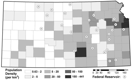 The study sites include all the KS-FdR (Figure 2, Table 1). Aside from groundwater in the low populated counties of western Kansas, KS-FdR are the most important drinking water sources for the state’s citizens [32]. Surface water storage and population density are clearly related, with 15 of the 24 KS-FdR located in the more heavily populated eastern third of the state (Figure 3). This is consistent with the fact that KS-FdR placement was driven principally by flood control needs, which are greater in the eastern part of the state due to increased precipitation (Figure 2).