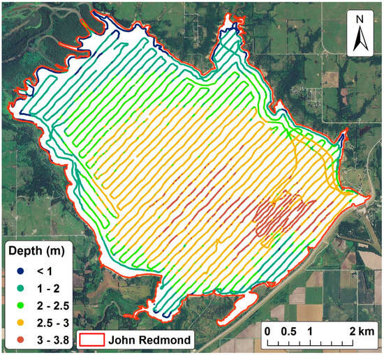 - Jakubauskas, M.; deNoyelles, J.; Martinko, E. Bathymetric Survey of John Redmond Reservoir, Coffey County, Kansas; Kansas Biological Survey, Applied Science and Technology for Reservoir Assessment Program, Kansas Biological Survey: Lawrence, KS, USA, 2014. [Google Scholar]