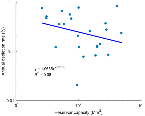 Annual depletion rate ranges from 0.02% (Webster) to 0.84% (Tuttle Creek) with a mean of 0.34%. Globally, reservoir capacity loss has been estimated to be in the range of 0.5–1% annually [11,47], but a review of the literature indicates that a broad range of capacity losses has occurred. For example, annual capacity loss is 1.5% for Tarbela Dam in Pakistan [11,48], 2% for Manwan Dam in China [49], and 0.2% on average in Ceará, Brazil, based on studying 21 reservoirs [50]. In Central Europe, a study of 19 reservoirs with storage capacity ranging from 1.5 to 226 Mm3 indicated an average annual depletion rate of 0.51% [51]. In the United States, 0.03% annual loss has been reported for Lake Mead upstream of Hoover Dam based on the sediment load in the first 13 years of dam operation [52]. By contrast, there are also cases where a reservoir was fully infilled by sediment only a few decades after dam construction; for example, full capacity loss was documented for Sweasey Dam in California in 1969 because of infilling sediment during 31 years of operation [53].