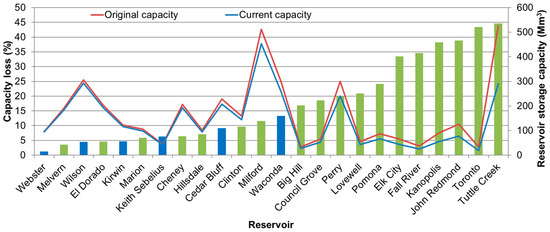Capacity (lines) and capacity loss (bars) are shown for the KS-FdR. Blue bars denote reservoirs in the western half of the state.