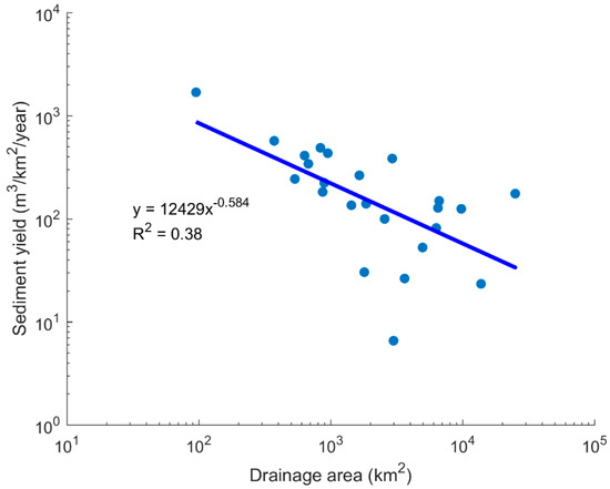 - Birkinshaw, S.J.; Bathurst, J.C. Model Study of the Relationship between Sediment Yield and River Basin Area. Earth Surf. Process. Landf. 2006, 31, 750–761. [Google Scholar] [CrossRef]