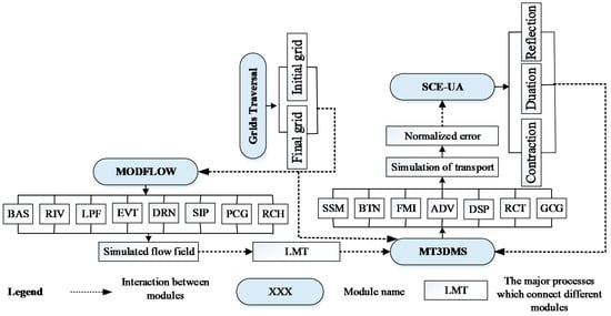 To produce reasonable and efficient identifications for unknown pollution source characteristics based on observation data, our proposed S/O model was built by integrating the Grids Traversal and SCE-UA algorithms into numerical simulators including MT3DMS and MODFLOW. MODFLOW is used for simulating a flow field that serves as an input to simulate pollutant transport process in MT3DMS [36]. The model structure is shown in Figure 1. More detailed descriptions of each module and its interactions with other modules are further discussed in Section 2.2, Section 2.3 and Section 2.4.