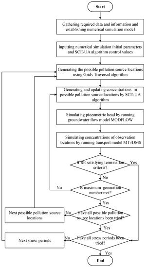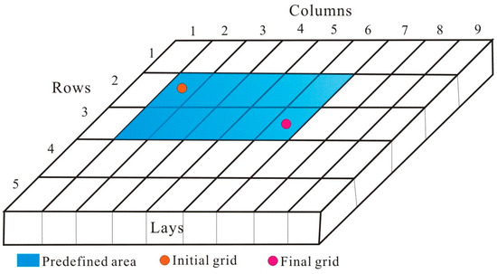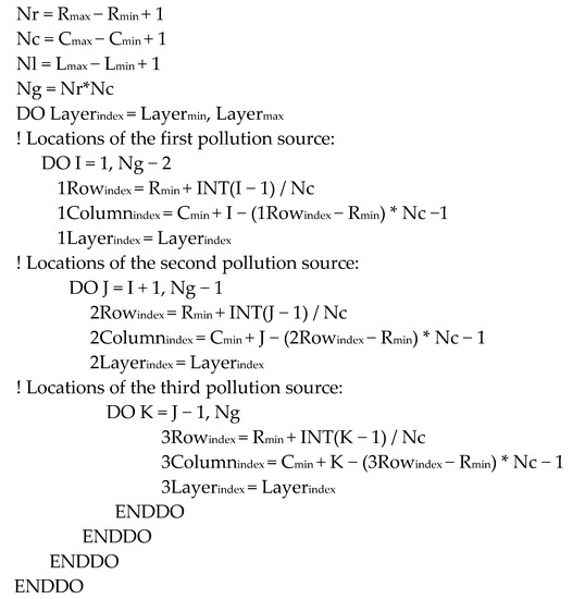 In this study, we proposed to use the Grids Traversal algorithm, which can automatically search all possible combinations of pollution source locations. In the framework of the Grids Traversal algorithm, the range of the predefined area is defined by a grid index of two endpoints, as shown in Figure 2, the initial and final grids. The initial grid defines the lower bounds of the row, column, and layer of the predefined area labeled as Rmin, Cmin, and Lmin, respectively; and the final grid defines the upper bounds of the row, column, and layer of the predefined area denoted as Cmax, Rmax, and Lmax, respectively. The S/O model requires the inputs for the lower and upper bounds and the number of potential pollution source locations. All possible combinations of pollution source locations can be automatically searched by the Grids Traversal algorithm within the area bounded by the initial and final grids. The search process was performed though a computer program written by FORTRAN internally coupled with the S/O model (Figure 3). For example, if the predefined area covers three grids which are marked as 1, 2, and 3 and two source locations are existent, the Grids Traversal algorithm would search step-by-step, i.e., (1, 2), (1, 3), and (2, 3), until all possible pollution source locations have been fully searched. For a transient flow, the Grids Traversal algorithm will search all possible pollution source locations at all time steps throughout the running time.