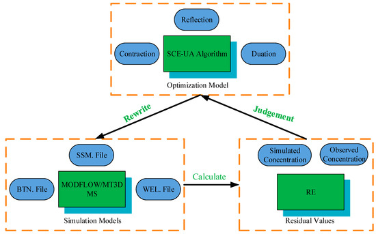 The S/O identification model can be divided into two main sections: simulation and optimization models. The simulation model includes MODFLOW and MT3DMS that were used to simulate the groundwater flow and contaminant transport processes. The optimization model includes the SCE-UA algorithm, which was used to automatically alter the concentrations of pollution sources to better fit the observational dataset. Figure 4 shows the interactions of the simulation and optimization models. The Grids Traversal algorithm mentioned above was incorporated into the S/O model. All of these functions are internally linked by FORTRAN interface programs and can be easily compiled into one execution file. This novel design modifies the way of data exchange from using external files to programming variables, which makes the S/O model feasible to deal with transient flow problems; this can significantly improve the accuracy and efficiency of computation for the inverse problem.
