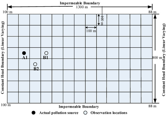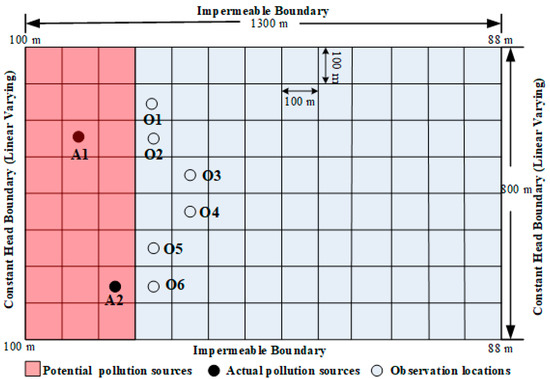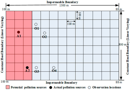 In all hypothetical scenarios, a two-dimensional confined aquifer with a simplified aquifer domain and boundary conditions was considered. This model grid was taken and modified from Datta, Chakrabarty and Dhar [46] and Singh and Datta [49]. The study area was assumed to be homogeneous and isotropic. The plan view is shown in Figure 6. The rectangle aquifer model had dimensions of 1300 m × 800 m and was discretized into square grid blocks with a grid size of 100 m × 100 m. The boundary conditions were specified as constant head = 100 m at west and constant head = 88 m at east, and no-flow was imposed at the upper and lower boundaries.