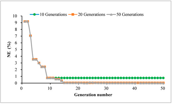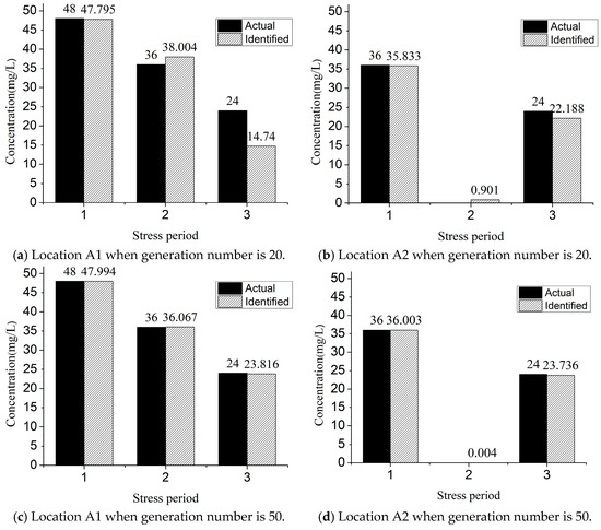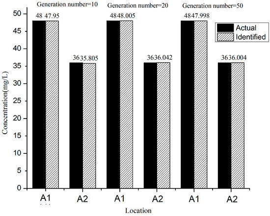 The effect of variation in generation number was additionally analyzed. The optimal identified results for generation numbers 10, 20, and 50 were both lower than 1%, which demonstrates that the S/O model is robust for inversely capturing the contaminant concentrations and locations (Table 7 and Figure 9). The identified results indicate that ND values could be reduced by increasing the number of generations, but with only a negligible improvement after the 10th generation.