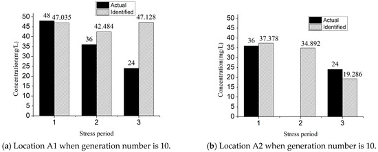 The optimal identification results of each stress period are shown in Table 9 and Figure 11 when the generation number was 10. The ND value is 2.91 at the first stress period, which was acceptable (Table 9), but the identified location and concentration does not match well with the actual values at the second and the third stress periods; the ND value increased up to 58 at the end of the third stress period. This indicates that satisfactory results cannot be inversely resolved if the generation number is 10.