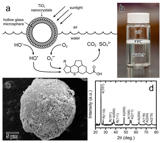 (a) Schematic of the floating photocatalyst (FPC) structure and mechanism of solar water treatment for napthenic acid mineralization (not to scale), (b) photograph of the FPCs added to water, (c) SEM image of a single FPC particle, and (d) XRD pattern of the FPC powder.