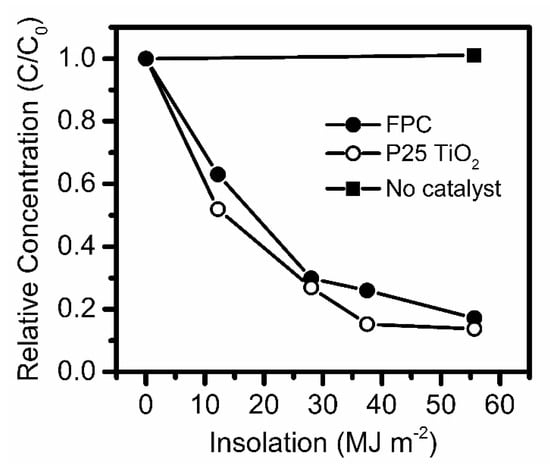 The photocatalytic activity of the FPC particles was assessed under natural sunlight for the degradation of AEO in raw OSPW under gentle mixing conditions (Figure 2). The FPC particles degraded >80% of the AEO within 22 h of sunlight exposure (~33.4 kJ L−1 cumulative solar UV), from a starting concentration of ~30 mg L−1 down to 4 mg L−1. The oxidized intermediate compounds produced during photocatalytic AEO degradation have been thoroughly characterized in our previous work, where photocatalysis was demonstrated to result in nearly complete mineralization of organic carbon [7,9]. The kinetics were apparently first order, as observed previously [7], and the pseudo-first order rate constant for the FPCs was 3.46 ± 0.20 × 10−8 m2 J−1. The FPCs compared favourably to P25 TiO2 as a benchmark photocatalyst, which had a pseudo-first order rate constant of 4.15 ± 0.34 × 10−8 m2 J−1, where the measured rate constants were indistinguishable from each other (p > 0.1). However, normalized on a TiO2 mass basis, the FPCs outperformed the P25 TiO2, with a rate constant of 9.45 × 10−8 m2 J−1 g−1 compared to 8.30 × 10−8 m2 J−1 g−1, respectively. Conventionally, nanoparticle slurries would be expected to outperform immobilized photocatalysts, such as the FPCs, due to enhanced contaminant mass transfer and higher accessible catalyst surface area [37,38]. However, in the low mixing regimes studied herein, the advantages provided by the FPCs of concentrating the photocatalyst at the water surface where sunlight intensity is highest apparently outweighed the typical disadvantages of immobilized systems. Thus the FPCs exceeded the activity of a known excellent photocatalyst formulation while enabling a convenient means of recycling through their buoyant properties.