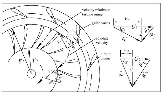 By analyzing the velocity triangles at the runners in turbine mode [5,33] shown in Figure 1, and are yielded as follows: