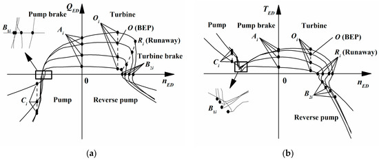 The distribution of COPs on the generic four-quadrant characteristic curves [30,34]: (a) characteristics; (b) characteristics.