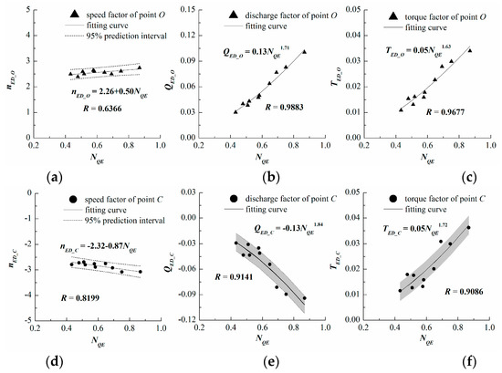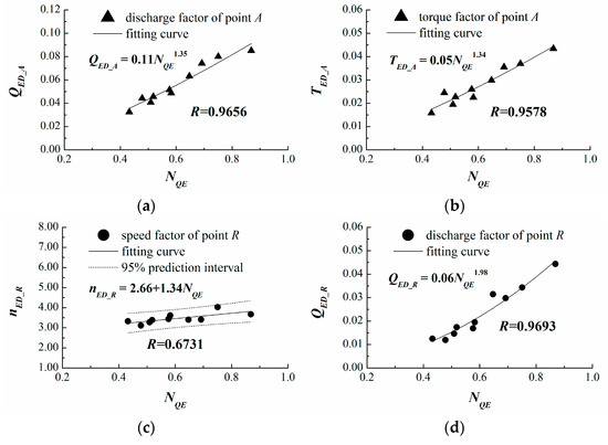 Likewise, the relationships between and the characteristic parameters of point A (the zero speed point) and point R (the runaway point) are analyzed first in Figure 5. Because the runner of a Francis pump-turbine is similar to that of a centrifugal pump, the centrifugal effect of the flow through the runner is significant under the runaway condition [26]. This leads to a large resistance torque, which makes the runaway speed smaller than that of a conventional Francis turbine. Since runaway speed increases little with increasing specific speed and the variation range of is small [9,11,16], the linear fitting can be used in Figure 5c, and the R value is 0.6731. To evaluate the confidence limits of for a given , the 95% prediction interval is provided. The other R values exceed 0.95, which indicates that , and have a strong correlation with the specific speed .