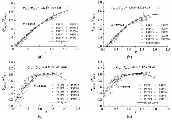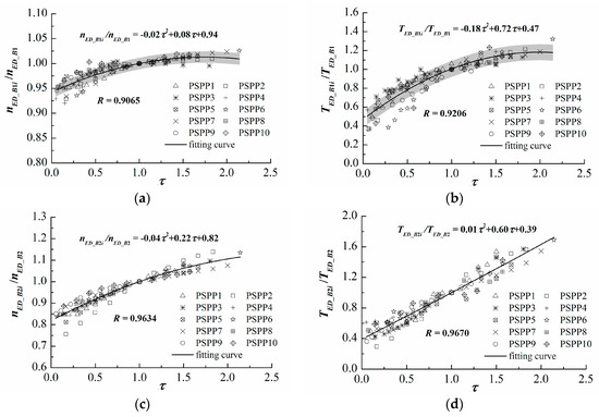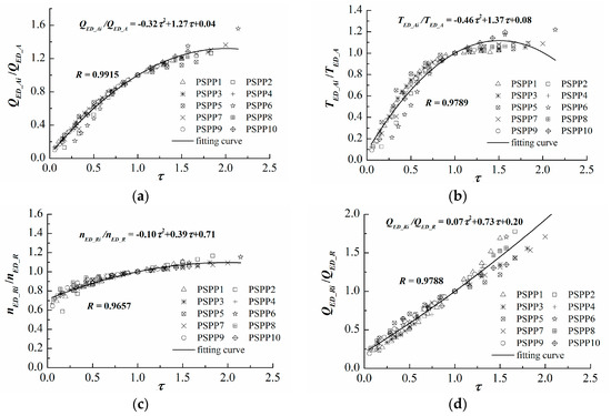 After determining the characteristic parameters of point O and point C, the relationship between and the dimensionless relative characteristic parameters (, , , , and ) still must be analyzed to identify the point sets Oi and Ci. For this purpose, 10 sets of statistical data with different specific speeds were arranged into one group, and the least squares method was then applied to obtain the undetermined coefficients in the polynomial functions. In addition, because the fitting curve must pass through a fixed point (1, 1), the locally weighted linear regression is used to obtain the optimal parameter estimation. The fitting results are shown in Figure 4. It can be seen that the dimensionless relative characteristic parameters (, , , ) of ten pump-turbines with significant differences in specific speed overlap greatly and that the R values are greater than 0.94. This indicates that the relative characteristic parameters are highly relevant to but are less related to . Thus, the above assumption was confirmed.
